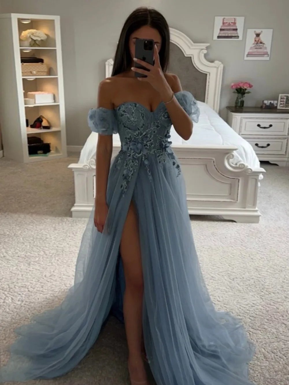 Sexy Off-Shoulder A-Line Prom Dress with Sweetheart Appliques Flowers